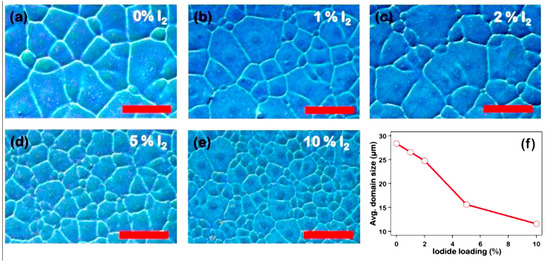 Optical micrographs of hybrid perovskite film (scale bar: 50 μm) from precursor with (a) 0%; (b) 1%; (c) 2%; (d) 5%; and (e) 10% iodine solution (40 mM). (f) Average domain size as a function of iodide loading during fabrication. The average domain size decreases as the iodide loading increases [96]. Copyright © 2015, American Chemical Society.