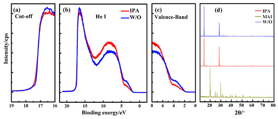 Ultraviolet photoelectron spectroscopy (UPS) of perovskite film with (red line) and without (blue line) IPA treatment on ITO glass substrates, i.e., (a) The secondary electron cut-off; (b) the full UPS spectrum using He I radiation; (c) the valence-band region; and (d) X-ray diffraction of perovskite film with and without IPA treatment on ITO glass substrates [113]. Copyright © 2015, Elsevier.