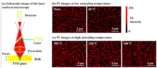 (a) Schematic image of the laser confocal microscopy and (b,c) the measured spatial PL images from the perovskite films annealed at low and high temperatures, respectively [117]. Copyright © 2015, American Chemical Society.