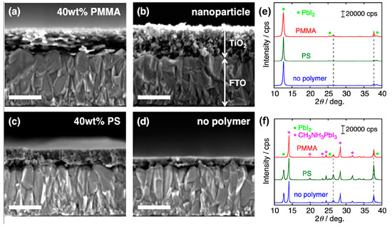 Cross-sectional SEM images of (a) TiO2 (40 wt %-PMMA); (b) TiO2 (nanoparticle); (c) TiO2 (40 wt %-PS); and (d) TiO2 (without polymer) on FTO/cTiO2 substrates. Scale bars are 200 nm, and Wide-angle XRD patterns of (e) PbI2 and (f) perovskite MAPbI3 films deposited on FTO/cTiO2/TiO2 (40 wt %-PMMA) (red line), FTO/cTiO2/TiO2 (40 wt %-PS) (green line), and FTO/cTiO2/TiO2 (no-polymers) (blue line). Symbols of green solid circle (•) and pink star (*) represent the XRD diffraction peak position of PbI2 and CH3NH3PbI3 [128]. Copyright © 2015, American Chemical Society.