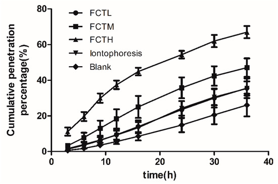 Q%-time curves of in vitro percutaneous tests on the FCT penetration enhancement groups (n = 6). (●) FCTL group; (■) FCTM group; (▲) FCTH group; (▼) iontophoresis group; (♦) blank group.