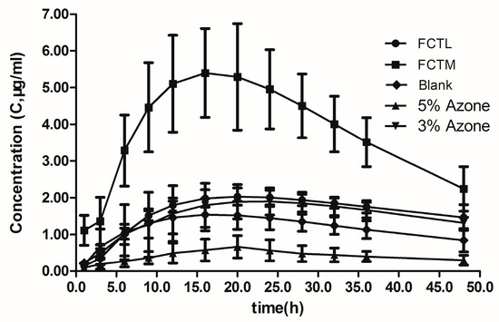 Findings showed that the C-t curve of the FCTM group was significantly higher than that of any other group, while the C-t curve of the FCTL group was slightly higher than that of the chemical penetration enhancer group. The AUC and AUMC of in vivo percutaneous absorption of FCT penetration enhancement was higher than that of the control group, AUC and AUMC of the FCTL group were slightly higher than that of the CPE group, and the AUC and AUMC of the FCTM group were significantly higher than that of any other group, indicating that FCT had a facilitating effect on IM transdermal absorption.