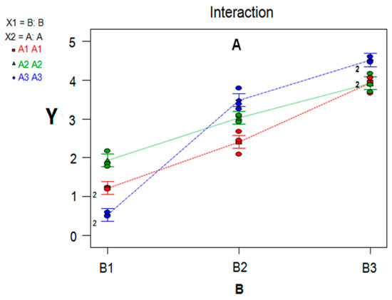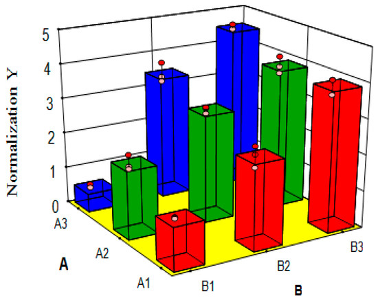 3D image of Factor A and B subjective effects: “A1→A3” and “B1→B3” mean that with the levels of Method A and B gradually increasing, the response value (Y), increases significantly.