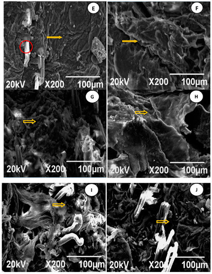 SEM images are shown in Figure 11A–J. Control group images indicated that the SC surface cells of SD rats were flat, relatively regular, and closely spaced with some ridgelines and zigzagging arrangement, as shown in the yellow-arrow part (Figure 11A).
