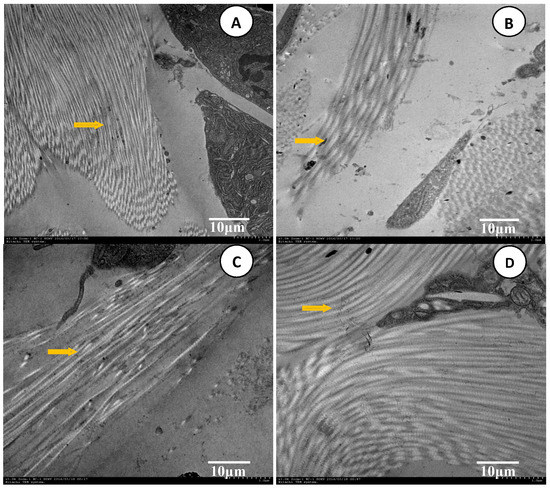 The control group (Figure 13A) indicated that the keratinocyte SC ultrastructure of normal SD rats had a compact “brick structure”, which was regularly and closely arranged, overlaid layer-by-layer, and had densely spaced and flat-shaped lipid composition between the layers. It constituted the complete lipid film with a compact structure, low water content, and high resistance, which has the function of barrier protection and is considered to be the major obstacle to the transdermal absorption of drugs (see yellow arrow).