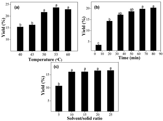 Effects of (a) extraction temperature, (b) extraction time, and (c) solvent/solid (S/S) ratio on oil yield from Chinese quince seed. Each value is the mean ± standard deviation (n = 3). Different letters of a–c in columns show statistically significant differences, p < 0.05.