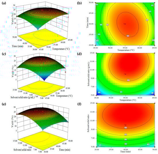 Response surface plots of oil yield affected by extraction temperature, extraction time and solvent/solid ratio. (a,b): time and temperature; (c,d): solvent/solid ratio and temperature; (e,f): solvent/solid ratio and time.