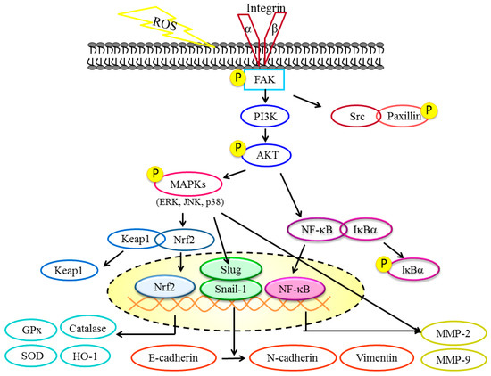 Reactive oxygen species (ROS)—including superoxide (O2−), hydroxyl radical (·OH), and H2O2—are constantly generated in aerobic organisms [7]. ROS act as inducers of matrix metalloproteinase (MMP) production and regulators in the EMT process, which are all related with cancer metastatic progression [7,8]. Excess intracellular ROS in microenvironments may trigger the activation of nuclear factor erythroid 2-related factor 2 (Nrf2) and downstream proteins such as heme oxygenase 1 (HO-1). For protecting the organism against harmful ROS, there are some enzymatic antioxidants (such as superoxide dismutase (SOD), glutathione peroxidase (GPx), and catalase) [9]. Therefore, there are more studies to investigate the relation between antioxidant and anticancer metastasis.