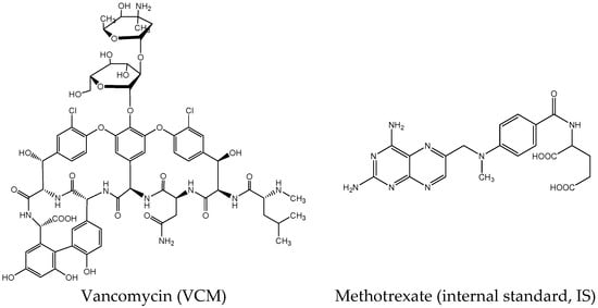 Chemical structures of vancomycin (VCM) and methotrexate (IS).