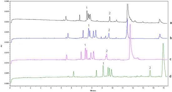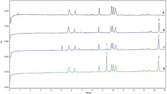 Typical chromatograms of blank plasma: (a) blank plasma spiked with IS; (b) blank plasma spiked with 1.0 µg/mL (lower limit of quantification, LLOQ) VCM and IS; (c) test plasma from peritoneal dialysis-associated peritonitis (PDAP) patient spiked with IS; (d) Peak 1: VCM; peak 2: IS. Experimental conditions: running buffer: 25 mM Na2B4O7 with 50 mM SDS (pH 9.5) and 2% sulfobutyl-β-CD. Other conditions are the same as indicated in Figure 2.
