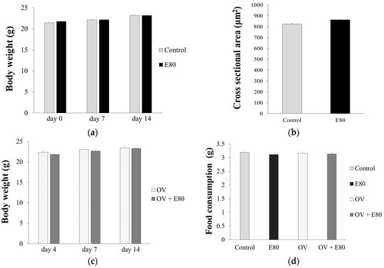 The body weight of the control group was almost the same as that of the E80 group after 14 days (Figure 2a, Table 1). Cross sectional area (CSA) of the plantaris muscle of the control group was almost the same as that of the E80 group on day 14 (Figure 2b, Table 1). In addition, after overload surgery, there was no difference in body weight or food consumption between the overload (OV) and OV + E80 groups after 14 days (Figure 2c,d, Table 1). These data show that E80 intake alone does not affect food consumption, body growth, or skeletal muscle mass.