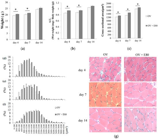 To examine the effect of E80 on overload-induced hypertrophy, we compared the wet weight of plantaris muscle and the wet weight of plantaris muscle/body weight and CSA of plantaris muscle between the OV and OV + E80 groups, on day 4 and day 7. The wet weight of plantaris muscle of the OV + E80 group was significantly higher than that of the OV group (Figure 3a). The wet weight of plantaris muscle/body weight of the OV + E80 group was also higher than that of the OV group (Figure 3b). As for CSA, the fibers of the OV + E80 group were much larger than those of the OV group on days 4, 7, and 14 (Figure 3c–g). Especially on day 7, CSA of the OV + E80 group was 12% larger than that of the OV group (Figure 3c). This difference can be seen in the pictures (Figure 3g). We also measured the frequency distribution of CSA and compared it between the OV + E80 and OV groups (Figure 3d–f). We observed a moderate rightward shift in the frequency distribution of CSA of the OV + E80 group on day 4 and day 7 (Figure 3d–f), but this shift disappeared on day 14 (Figure 3f). The rightward shift was consistent with the difference in the wet weight of plantaris muscle and the wet weight of plantaris muscle/body weight between the OV + E80 and OV groups on day 4 and day 7. The reason for dissipation of shift at day 14 was that functional overload-induced hypertrophy was reaching convergence point. These data show that the OV + E80 group has thicker muscle fibers than the OV group.
