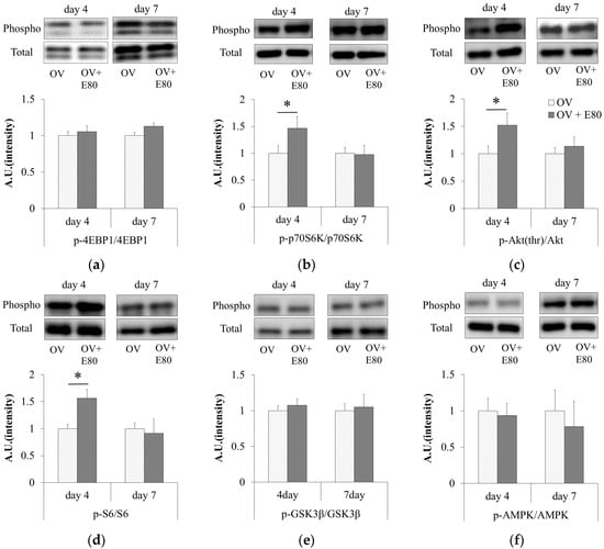 We measured the level of Akt phosphorylation in the plantaris muscle of functional overload mice, and compared it between the OV + E80 and OV groups. On day 4, the phosphorylation level of Akt in the plantaris muscle of the OV + E80 group significantly increased (Figure 4a). Next, we evaluated the phosphorylation levels of p70S6K and 4EBP1. On day 4, the phosphorylation level of p70S6K significantly increased in the plantaris muscle of the OV + E80 group (Figure 4b), but that of 4EBP1 did not increase (Figure 4c). Since S6 is a direct target of p70S6K [14], the phosphorylation level of S6 was measured. Consistent with that of p70S6K, the phosphorylation level of S6 increased on day 4 in the plantaris muscle of the OV + E80 group (Figure 4d). On the other hand, no change was observed in the phosphorylation levels of GSK3β and AMPK (Figure 4e,f). These data show that E80 intake promotes the phosphorylation of Akt, p70S6K, and S6 in the plantaris muscle of functional overload mice on day 4.