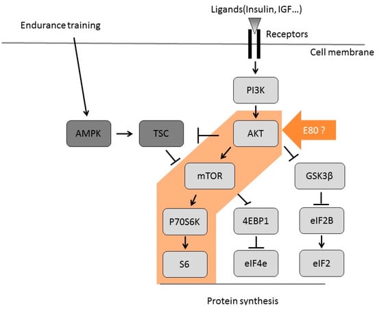 Akt functions as a crucial regulator of skeletal muscle hypertrophy. Akt promotes the activation of GSK3β and mTOR via independent pathways (Figure 5), which is important for skeletal muscle hypertrophy [20]. When GSK3β is phosphorylated, the phosphorylation of Eukaryotic Initiation Factor 2 (eIF2B) on serine 535 decreases and the translation initiation and protein synthesis process is promoted [15]. The levels of phosphorylated p70S6K correlate with the magnitude of skeletal muscle hypertrophy after resistance exercise [20]. In addition, the degree of p70S6K and S6 phosphorylation in human skeletal muscle depends on the training volume [21]. These reports suggest that elevated phosphorylation of p70S6K (indicator of mTOR activity) is essential for skeletal muscle hypertrophy. In this experiment, E80 intake promoted the phosphorylation of Akt, p70S6K, and S6 (Figure 4a,b,d), suggesting that E80 activates Akt and the downstream targets of mTOR (Figure 5). E80 was thought to regulate protein synthesis via the Akt and S6 signaling pathways, and thereby promote overload-induced skeletal muscle hypertrophy. Hence, E80 can be considered a useful supplement for increasing skeletal muscle hypertrophy and may have a potential role in human skeletal muscle development