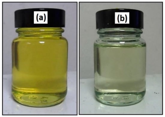 Appearance of jatropha oil‑based polyol (b); compared with the starting jatropha oil (a).