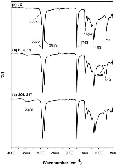 From the EJO spectra, the weak and broad shoulder around 3425 cm−1 attributed to the OH group was observed, instead of a remarkable peak, as reported in other studies [14,15]. This indicates that the minimum side reaction associated with the ring opening of epoxy with water/acid during epoxidation.