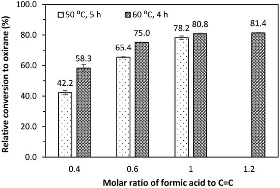 Figure 5 and Figure 6 present the oxirane oxygen content, OOC (%), and relative conversion to oxirane of epoxidised jatropha oil prepared by different molar ratios of formic acid to the oil double bond and reaction temperature. The epoxidation reaction at 50 °C was conducted over 5 h, while the reaction at 60 °C was conducted over 4 h. Overall, increasing the mole ratio of formic acid to the oil double bond from 0.4 to 0.6 increased the OOC from 2.42% to 4.49% and from 3.26% to 4.64% for the reactions conducted at 50 °C and 60 °C, respectively. However, the increase in the OOC becomes less significant when there is a 20% excess of formic acid in the mixture. About 80% relative conversion to oxirane was achieved when the mole of acid and the oil double bond were equal.
