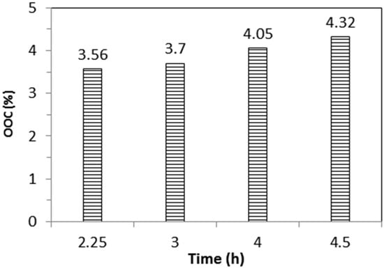 A reaction parameter of 60 °C and a molar ratio of 0.6 were selected for the preparation of epoxidised jatropha oil to be further converted to polyol by oxirane ring opening. For this purpose, the amount of JO was scaled up to 400 g. Figure 7 shows the effect of varying reaction times with respect to the OOC. Increasing the reaction time increased the OOC in the epoxidised JO. It can be seen that the OOC obtained at 4 h was lower than the results found in the previous work, in which a small scale sample was used. This is due to the low mass transfer coefficient in a larger scale of preparation, as the other factors such as the heat transfer area are not well considered. At this stage, all the epoxidised JO was converted to polyol by the oxirane ring opening method using methanol.