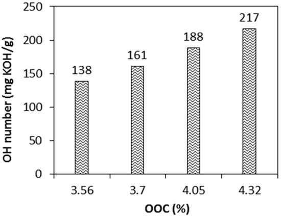 The relationship between %OOC and OH number is expressed in Figure 8. As expected, higher OH numbers of polyol were obtained by increasing the %OOC. Polyol with increasing OH numbers from 138–217 mgKOH/g was successfully produced from epoxidised jatropha oil with an OOC increase from 3.56 to 4.32. These values are comparable with other vegetable oil based polyols synthesised from soybean oil, castor oil, linseed oil, and palm oil [16,17,18]. The OH numbers will determine the amount of diisocyanate required for polyurethane synthesis. Depending on the application, vegetable oil-based polyols with relatively high OH numbers are generally desired for production of rigid polyurethane [19]. However, polyols with low OH numbers are advantageous in terms of bio-based content, as they require less diisocyanate as a hard segment in the polyurethane [20]. The combination of the OH numbers and hard segment content was reported as a key role in controlling the structure and the thermophysical and mechanical properties of the polyurethane film [16,17,18,19,20].