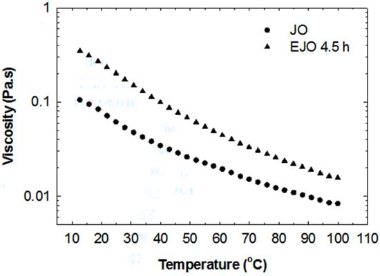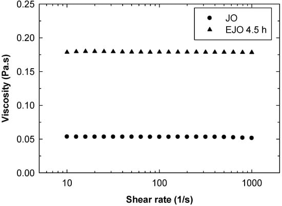 The functionalisation of double bonds to the epoxy groups leads to a significant increase in viscosity. As shown in Figure 12, the viscosity of EJO 4.5 h at 25 °C is 180 mPas, while the viscosity of the starting jatropha oil is 55 mPas. Both JO and EJO 4.5 h exhibit Newtonian behaviour in the measured shear rate ranges. Increasing the temperature causes a significant reduction of viscosity, as shown in Figure 13. Although having a dimer structure, the viscosity of the EJO 4.5 h is still low and comparable to completely epoxidised soybean oil (ESO), as reported by Petrovic and co-workers [21]. It is worth noting that a low viscosity ESO produced commercially has been receiving attention for use as a reactive diluent to reduce the viscosity of a petroleum-based epoxy, thus improving the processibility of the resin [22].