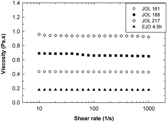 Other physico-chemical properties of the JOL are given in Table 4. The polyols produced were slightly yellow in colour, and all of them were liquid at room temperature. A polyol of industrial importance is commonly required to have low viscosity and a high hydroxyl value. From our previous work, waterborne polyurethane film synthesised from JOL 138 was soft and tacky with poor structural rigidity [20]. For this reason, only JOL 161, JOL 188, and JOL 217 were analysed in terms of viscosity and rheology. In polyurethane production, viscosity is an important criterion as it determines the ease of pouring and pumping the polyol into the machine to be mixed with diisocyanates [18]. As shown in Figure 10, the viscosity of the JOL increased from 430 to 940 mPas when the OH number increased from 161 to 217 mgKOH/g. The viscosity is comparable with soybean oil-based polyol [24,25]. With a lower OH number, a viscosity of 2500 to 35,000 mPas was reported for polyol derived from crude palm oil [18]. A commercial polyol is available in various viscosity ranges from as low as 230 mPas up to above 10,000 mPas, depending on the OH number, functionality, production routes, and its vegetable oil origin types [26].