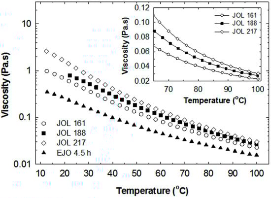 The JOL exhibits Newtonian behaviour similar to the rheological behaviour of the starting EJO, as shown in Figure 14. With increasing temperature, the viscosity decreased significantly (Figure 15). Based on these results, the processing temperature of the JOL could be easily correlated with viscosity. For example, the JOL has to be heated to a temperature above 70 °C to achieve a viscosity of less than 100 mPas (see inset in Figure 15). In waterborne polyurethane production, the reaction temperature is usually in the range of 65 °C to 90 °C [16,27,28].