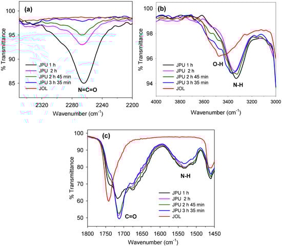 FTIR spectra of (a) the isocyanate group in polyurethane, (b) the hydroxyl and urethane group in polyol and polyurethane respectively, and (c) the carbonyl and urethane group in polyurethane.