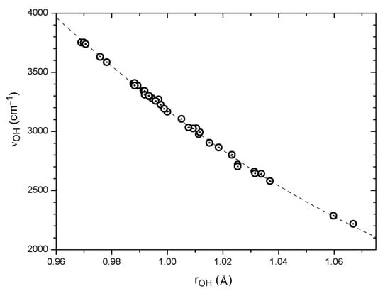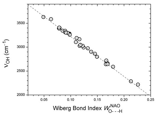 Finally, an excellent linear correlation is observed between calculated νOH wavenumbers and Wiberg bond indices [95,96] for H···O distances, as shown in Figure 3 (33 data points: R = −0.996, SD = 30 cm−1). The Wiberg bond indices were computed in a basis of natural atomic orbitals (NAO) [97] using the Gaussian software package [80]. The Wiberg bond index is designed as a measure of covalent bonding. The excellent correlation in Figure 3 indicates a tendency towards increased covalent character when moving from weaker to stronger hydrogen bonds. The question of the covalency of hydrogen bonding has recently been discussed by several authors [7,8,10].