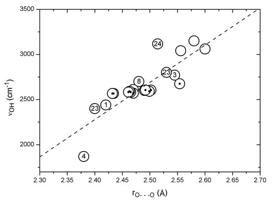 Correlation between observed OH stretching wavenumbers and observed O···O distances (see text). Points from Bertolasi et al. [123] are marked with dots. The correlation line is Y = −7616 + 4122.9 · X (22 pts: R = 0.83, SD = 161 cm−1).