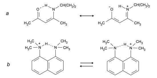 - Chmielewski, P.; Ozeryanskii, V.A.; Sobczyk, L.; Pozharskii, A.F. Primary 1H/2H isotope effect in the NMR chemical shift of HClO4 salts of 1,8-bis(dimethylamino)naphthalene derivatives. J. Phys. Org. Chem. 2007, 20, 643–648. [Google Scholar] [CrossRef]