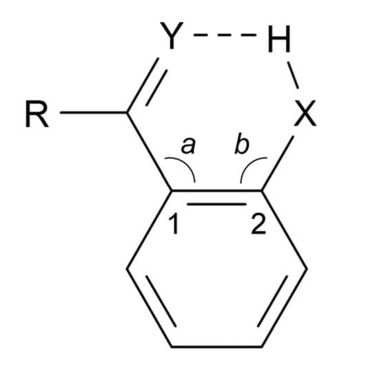 According to the definition [4], the greater the lengthening of the X–H bond distance in the X–H···Y system, the stronger and shorter is the H···Y hydrogen bond. Factors important for a short H···Y distance are the bond distance between carbons 1 and 2, the a and b angles, and of course the X–H bond length, see Scheme 2. The H···Y distance will be influenced by the three abovementioned factors. The X···Y distance has been used extensively as a hydrogen strength parameter since it is relatively easy to measure in contrast to the X–H and H···Y distances; correlations which are based solely on crystallographic X–H or H···Y distances are, very probably, invalid [22,23,24]. On the other hand, the use of the X···Y distance has been criticized by Perrin [3]. Factors decreasing the a and b angles are steric strain from substituents at positions 3 or 6. In the latter case, twisting of the RY substituent out of the ring plane may occur [25,26]. Examples of strong steric compression are seen in 1,3,5-triacetyl-2,4,6-trihydroxybenzene (1) [27] and in similar systems [26]. Twisting of the RY substituent out of the ring plane is seen in, e.g., 1-acetyl-2-hydroxynaphthalene (2) [25]. The importance of directionality has been investigated by Majerz [28].