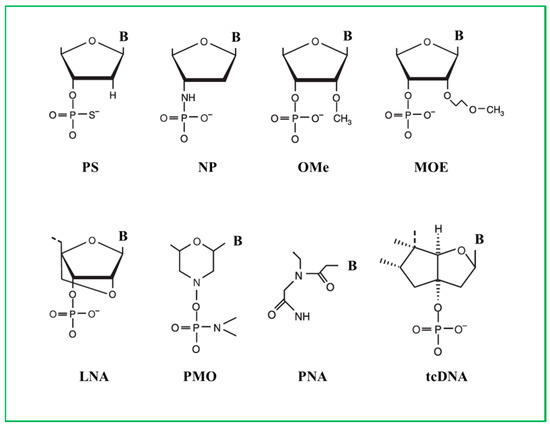 Core backbone modifications of the PS structure increase stability as it occurs in the 2′-O-methly (2′MeO) and in the 2′-O-methoxyethyl (2′MOE) ASOs (Figure 1). These chemical modifications make the ASOs more resistance to nuclease and even more specific to their binding to RNA [56]. Compared to the phosphodiester, these molecules could be potentially more cytotoxic due to their chemical structure and could generate immunogenic responses [57].