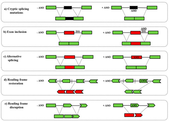 - Another well-studied application is the splicing modulation of the nuclear pre-mRNA. ASOs can target specific regions as 5′/3′ splice junctions or exonic/intronic splicing enhancer/silencer sites (ESEs or ISEs, ESSs or ISSs) leading to the skipping/inclusion of an exon. This strategy can be used to: (i) restore the mRNA reading frame by exon skipping in diseases such as DMD in which frame-shift deletions or non-sense mutations cause the functional protein loss; (ii) promote the inclusion of exons, as occurs in SMA where ASOs induce the inclusion of the exon 7 in the SMN2 gene; (iii) introduce an out-of-frame deletion for reducing protein expression, as in Alzheimer disease or in Amyotrophic Lateral Sclerosis (Figure 2) [67].