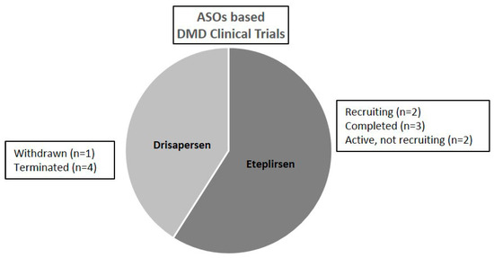 Another recent paper by Mendell and collaborators [90] presents additional functional data (6MWT and functional pulmonary tests) on the DMD treated population enrolled in the study described above. Twelve patients, previously enrolled for the 48 weeks treatment study [89], did not dismiss Eteplirsen administration and are still under treatment. Data arisen from the 6MWT have been collected semiannually from the 48 to 168 weeks of treatment. Mendell and colleagues showed that Eteplirsen treated patients present a slower 6MWT decline compared to the untreated controls. This observation could be promising for the field: indeed this DMD cohort analyzed and followed up by Mendell and colleagues is still under Eteplirsen treatment without reporting no serious adverse events and showing modest clinical benefits [90]. New assumptions in the DMD field are emerging by the analysis of clinical trial data herein reported such as the decline in the 6MWT could depend on the genetic mutation and consequent different clinical phenotype [90]. PMOs are currently developed by Sarepta Therapeutics, which is sponsoring clinical trials at different development stage: the study for skipping exon 51 (Eteplirsen-AVI4658) is currently in phase III, whereas clinical investigations for skipping exon 45 (SRP-4045) and exon 53 (SRP-4053) are currently in phase II. Currently, on the official website it has been reported that 7 DMD clinical trials are under investigations related to Eteplirsen administration (Figure 3). Sarepta submitted to FDA an accelerated approval for Eteplirsen in October 2015 and on 19 September 2016 received the conditional approval from FDA as announced on the US regulatory agency website [91] and on the biopharma company website [92]. Sarepta is also currently testing other PMO ASOs for skipping other DMD exons in pre-clinical studies.