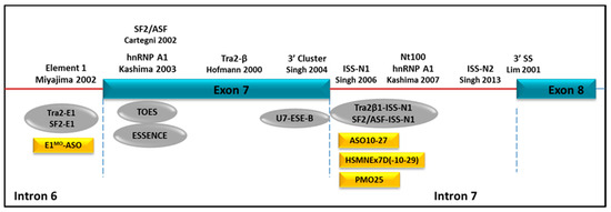 Since SMN2 gene is intact in all SMA patients and they have usually more than one copy of SMN2, alternative splicing of the SMN2 gene has become an attractive therapeutic target by strategies to augment the inclusion of exon 7 in the mature transcript. In the SMN2 gene, a few regulatory elements have been shown to modulate the alternative splicing of exon 7. These include element 1 in intron 6, an SF2/ASF or hnRNP A1 binding site in exon 7, the Tra2-β1 binding site in exon 7, the 3′ cluster at the 3′-end of exon 7, the splicing silencer N1 (ISS-N1) and a recently reported ISS-N2 in intron 7, and hnRNP A1 binding sites in intron 7 (Figure 4) [22,23,93,94,95,96,97,98,99].