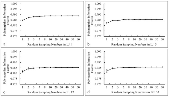 Polymorphism Information Content of the four accessions at different sampling sizes. (a) LJ. 1; (b) LJ. 3; (c) IL. 17; (d) BE. 33.