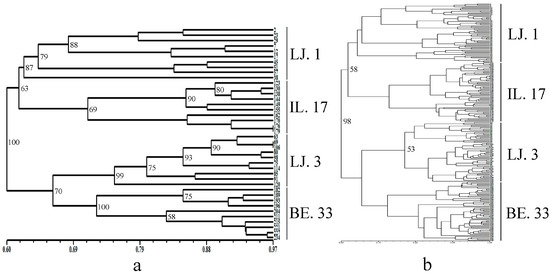 The Unweighted Pair Group Method with Arithmetic Mean (UPGMA) dendrogram of common vetch based on Jaccard’s genetic similarity; only bootstrap values higher than 50% are presented. (a) Forty individuals of four germplasm; (b) 240 individuals of four germplasm and the genetic distance of start codon targeted (SCoT) markers.