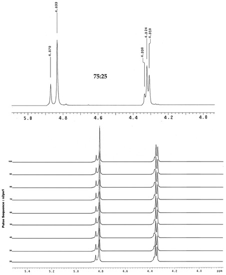 In the nuclear magnetic resonance spectra, two possible products were observed by 1H- and 13C-NMR. Figure 1a shows the 1H-NMR spectrum of compound 1, where the signals corresponding to the benzylic protons found at approximately 4.4 ppm and the methylene hydrogens alpha to the carbonyl group at 4.8 ppm are observed in a ratio of 75:25.