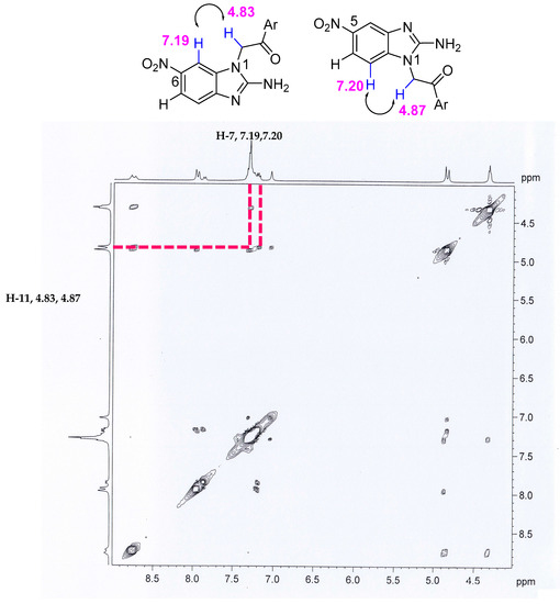 Thus, the existence of a mixture of regioisomers was proposed and derivative allocation was performed. The formation of the regioisomer mixture could be explained by the possible formation of hydrogen bonds between the carbonyl oxygen group and the hydrogen of the amino group. This favors the formation of both regioisomers and the hydrogen bond, which gives them a conformation in three dimensions composed of a 6-membered ring, anchoring the conformations observed for these compounds and reducing the energy to a global minimum to stabilize the molecules (Figure 2). To strengthen the hypothesis of the formation of a mixture of regioisomers, two-dimensional NMR experiments were performed, in which a correlation of protons was observed in the NOESY spectrum at 4.8 ppm (–CH2) with the corresponding aromatic proton of the benzimidazole, in this case with the H-7, indicating that the possible structure is binding to the N1, which would generate a mixture of regioisomers (Figure 2).