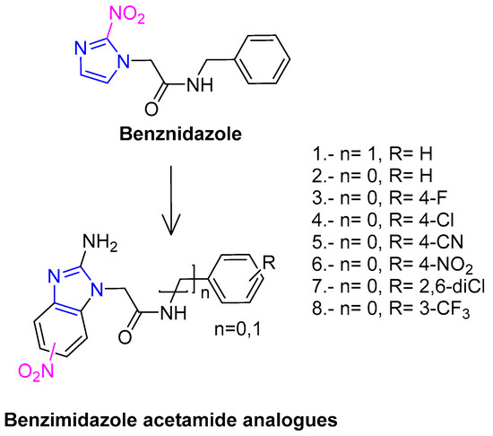 The compounds shown in Table 1 were designed based on the structures of benznidazole, a drug used to treat trypanosomiasis, and widely recommended as an antiprotozoal agent [24,25].