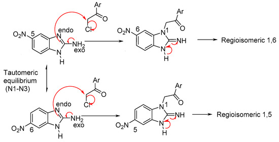 Scheme 3 describes the proposed reaction mechanism for the formation of the regioisomers. Initially, the electron pair of the nitrogen exo located in C-2 is introduced and is directed towards the N-3 endo (tautomeric electron transfer to Petrova et al.) [33]. The anion formed nucleophilic ally displaces the chlorine from the amide, where the N1 enters its electron pair system to regenerate aromaticity, leading to the formation of the reigoisomer mixture. These were inseparable from one another using conventional methods, such as crystallization and open column chromatography.