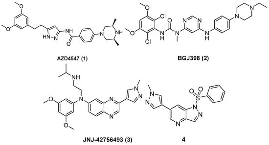 16. Guagnano, V.; Furet, P.; Spanka, C.; Bordas, V.; le Douget, M.; Stamm, C.; Brueggen, J.; Jensen, M.R.; Schnell, C.; Schmid, H.; et al. Discovery of 3-(2,6-dichloro-3,5-dimethoxy-phenyl)-1-{6-[4-(4-ethyl-piperazin-1-yl)-phenylamin o]-pyrimidin-4-yl}-1-methyl-urea (NVP-BGJ398), a potent and selective inhibitor of the fibroblast growth factor receptor family of receptor tyrosine kinase. J. Med. Chem. 2011, 54, 7066–7083. [Google Scholar] [CrossRef] [PubMed]