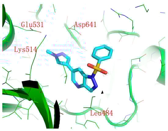 As reported in c-Met inhibitor development [15], the 1-sulfonylpyrazolo[4,3-b]pyridine acts as the hinge binder, and the benzene group of compound 4 forms a π–π interaction with the residue Tyr1230 in the c-Met ATP binding site. Since compound 4 is a novel FGFR inhibitor, both from the view of chemical ring system and from the shape of the structure, we need to probe its binding mode. Therefore, we performed a docking study to predict the binding mode of compound 4 in the FGFR1 ATP binding site prepared from a PDB (Protein Data Bank) structure (PDB code: 3TT0) [16]. As shown in Figure 2, the docking results indicated that the pyrazolo[4,3-b]pyridine ring still acts as the hinge binder to anchor the molecule in the ATP binding site of FGFR1. Therefore, the benzene group is located at the middle of the ATP binding site and the linking sulfamide group makes it perpendicular to the pyrazolo[4,3-b]pyridine. We inspected the predicted complex structure of 4 bound to FGFR1 kinase and did not find any possible residues could form the π–π interaction with the benzene group of compound 4. Then, we designed three other compounds by modifying the connecting group of sulfamide. As shown in Table 1, three compounds showed moderate inhibitions towards FGFR1, but the activities are all inferior to the starting compound 4. This indicated that the nearly right angle between the benzene group and pyrazolo[4,3-b]pyridine ring is important to the binding affinity. Together with the unique shape of compound 4, we wanted to retain this connecting group for late optimization.