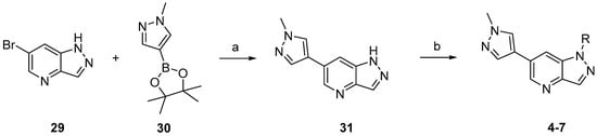 Scheme 1. The synthesis route of compounds 4–7. Reagents and conditions: (a) Pd(dppf)Cl2, K2CO3, Dioxane:H2O (v/v = 4:1), 80 °C, 2 h, 86% yield; (b) NaH, Dimethylformamide (DMF), R-SO2Cl, room temperature (r.t.), 1–4 h, 76–83% yield.