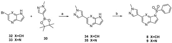 Scheme 2. The synthesis route of compounds 8 and 9. Reagents and conditions: (a) Pd(dppf)Cl2, K2CO3, Dioxane:H2O (v/v = 4:1), 80 °C, 3 h, 89% yield (34), 82% yield (35); (b) NaH, DMF, benzenesulfonyl chloride, r.t., 2 h, 82% yield (8), 79% yield (9).