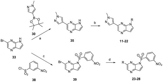 Scheme 4. The synthesis route of compounds 1128. Reagents and conditions: (a) Pd(dppf)Cl2, K2CO3, Dioxane:H2O (v/v = 4:1), 80 °C, 3 h, 82% yield; (b) NaH, DMF, R-SO2Cl, r.t., 1–4 h, 72–87% yield; (c) NaH, DMF, r.t., 2 h, 80% yield; (d) Pd(dppf)Cl2, K2CO3, Dioxane:H2O (v/v = 4:1), 80 °C, 2–4 h, 81–92% yield.