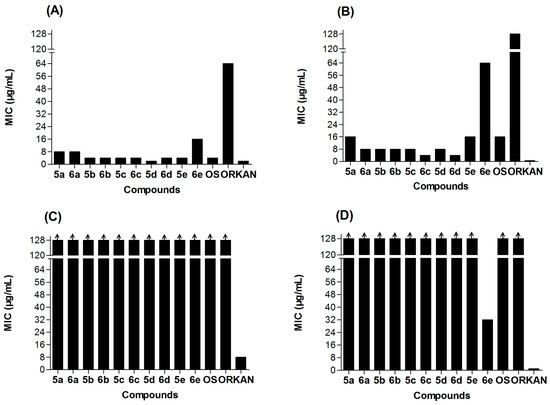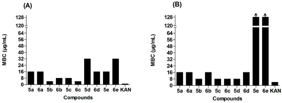 As shown in Figure 3, the minimum bactericidal concentration (MBC) was measured for compounds 5a–e and 6a–e against B. subtilis 168 and MRSA USA300. The derivatives with bactericidal activities in these strains warrant further studies as anti-bacterial leads. The results showed that compounds 5a–e and 6a–e possess good bactericidal activity against B. subtilis 168 with MBC values of 4–32 µg/mL, and compounds 5a–d and 6a–d possess good bacterial activity against MRSA USA300 with MBC values of 8–16 µg/mL. Compounds 5b, 5c and 6c could be candidates since they possess the most potent activities against the community-acquired meticillin-resistant strain MRSA USA300 and laboratory strain B. subtilis 168.