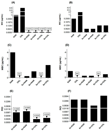 According to Figure 4, the MIC of kanamycin (KAN) and chloramphenicol (CHL) against MRSA USA300 and B. subtilis 168 significantly decreased when combining compounds 5c and 6c at half-MIC, and the synergistic effect was significant (FICI < 0.5, According to the literature [24]: FICI = FICA + FICB = (MICA+B/MICA) + (MICA+B/MICB). When FICI value was less than or equal to 0.5, it has a synergistic effect). Compounds 5c and 6c could decrease the MICs of KAN or CHL against MRSA USA300, and the MICs were all less than 0.0078 µg/mL (FICI < 0.0088, 0.0098, 0.0029, 0.0039). Synergistic activity against B. subtilis 168 was also observed during the combination of 5c and 6c with KAN or CHL (FICI = 0.2656, 0.2656, 0.0938, 0.3750). In contrast, when 5c (or 6c) was combined with KAN, the bactericidal activity of KAN against MRSA USA300 was significantly enhanced from 4 µg/mL to 0.25 (or 1) µg/mL. For B. subtilis 168, potent bactericidal effects were also observed during the combination of KAN with 5c and 6c. Surprisingly, CHL alone was bacteriostatic, but possessed bactericidal effect when combined with 6c, with MBC value of 2 µg/mL against MRSA USA 300 and 0.5 µg/mL against B. subtilis 168.