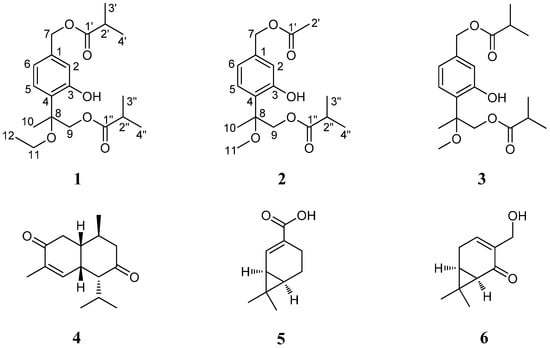A. adenophora is seldom attacked by microorganisms (including bacteria and fungi) and insects, suggesting that rich bioactive secondary metabolites that might be defense-related, would exist in this plant. Previous phytochemical studies have revealed structurally diverse chemicals including (mono-, sesqui-, di-, and tri-) terpenoids, phenylpropanoids, flavonoids, coumarins, sterols and alkaloids were reported from this species [6,7,8], some of which were shown to possess allelopathic [9,10], phytotoxic [11] and antifeedant [12] activities. Our recent study also revealed some bioactive natural products, including bioactive quinic acid derivatives and monoterpenes from the aerial parts of A. adenophora and some phenolic compounds with allelopathic potential from the roots of this species [13,14,15]. In continuation of our work on searching for bioactive natural compounds of A. adenophora, a further study on the roots of this invasive plant was conducted, which led to the isolation of two new thymol derivatives (1 and 2) along with four known compounds (3–6) (Figure 1). Herein, we report the isolation and structural elucidation of these compounds, as well as their antibacterial and cytotoxic activities.