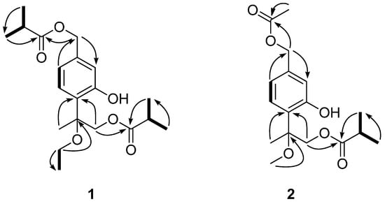 Compound 2 was also obtained as a yellowish oil. Its molecular formula C17H24O6 was deduced from the HR-ESI-MS m/z 347.1479 [M + Na]+ (calcd. for C17H24O6Na, 347.1471). Its spectral features and physicochemical properties suggested 2 to be also a thymol derivative. Careful comparison indicated that the 1H and 13C (DEPT) NMR data (Table 1) of 2 were very similar to those of 3, except that the resonances for the isobutyryloxy group that located at C-7 in 3 were replaced by the signals (δH 2.10 (3H, s, H3-2′); δC 170.8 (C-1′), 20.9 (C-2′)) for an acetoxy group in 2 (Figure 1). This deduction was supported by its molecular formula and the observation of significant 1H-13C long-range correlation signals in the HMBC spectrum of H-7 (δH 5.03) and H-2′ (δH 2.10) with C-1′ (δC 170.8) (Figure 2). By further detailed analysis of 2D NMR (1H-1H COSY, HSQC, and HMBC) spectra (Figure 2), the 1H- and 13C spectroscopic NMR data were unambiguously assigned as shown in Table 1, and they were fully supported by the structure of 2 as shown in Figure 1. Accordingly, the structure of 2 was thus determined as 7-acetoxy-8-methoxy-9-isobutyryloxythymol.